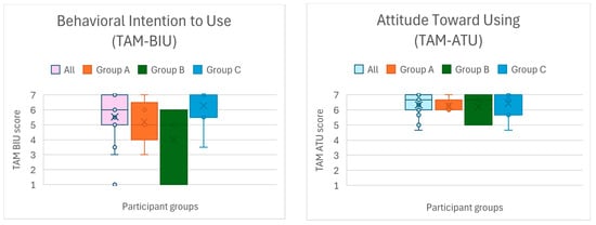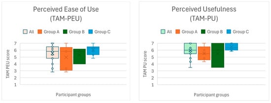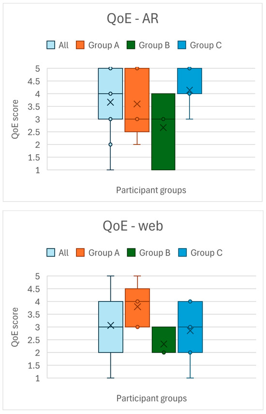 Participants also completed several standardized questionnaires at different points in the study (summarized in Table 2). Before beginning any tasks, a custom demographic and background questionnaire gathered basic information (age, gender, education, occupation) as well as prior experience with relevant technologies (e.g., CAD software, interior design tools, AR, VR) and real estate experience (ownership or past involvement in home buying, building, renovation, etc.). This was performed to ensure a diverse sample and to later interpret results in light of user background. To quantify individual differences in affinity for technology, we administered the Affinity for Technology Interaction (ATI) scale [23] as a pre-test measure. During the study, after each application task, participants filled out a one-item Experience Quality (QoE) questionnaire (rating overall experience quality on a 5-point Mean Opinion Score scale from 1 = Poor to 5 = Excellent). They also filled out the System Usability Scale (SUS) [24] after each of the three platform tasks (web, AR, VR). To assess the sense of spatial presence provided by the immersive applications, we used selected dimensions from the MEC Spatial Presence Questionnaire (MEC-SPQ) [25]. Specifically, we included subscales that measure the Spatial Situation Model (SSM), Self-Location (SPSL), Possible Actions (SPPAs), and Suspension of Disbelief (SoD), each rated on a 5-point agreement scale. These presence questionnaires were administered after each AR/VR task and not for the web app, since spatial presence is only relevant to XR experiences. Finally, to evaluate technology acceptance of the overall system, we employed a modified Technology Acceptance Model (TAM) questionnaire [26,27], at the end of the session. This questionnaire, administered once after using all components, gathered user ratings of the system’s perceived ease of use (PEU) and perceived usefulness (PU), as well as their attitude toward use (ATU) and behavioral intention to use (BIU) the system in the future. Unlike the other questionnaires which were tied to specific applications, the TAM-based questions were phrased to assess the entire multiplatform system (web + AR + VR together) as an approach to house design. All questionnaires were provided in the users’ native language (Croatian), using carefully translated/adapted versions to ensure comprehension.