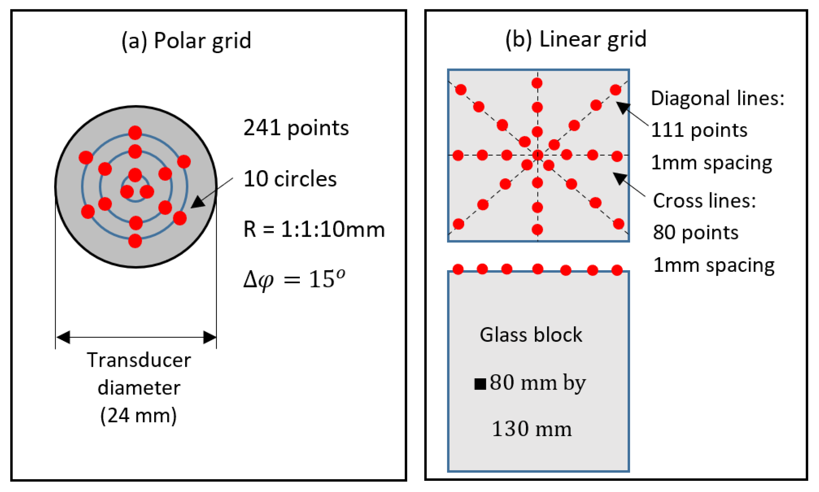 Figure 1a), responses are measured along the transducer diameter (40 measuring points with 0.5 mm spacing), as well as using a polar grid, shown in