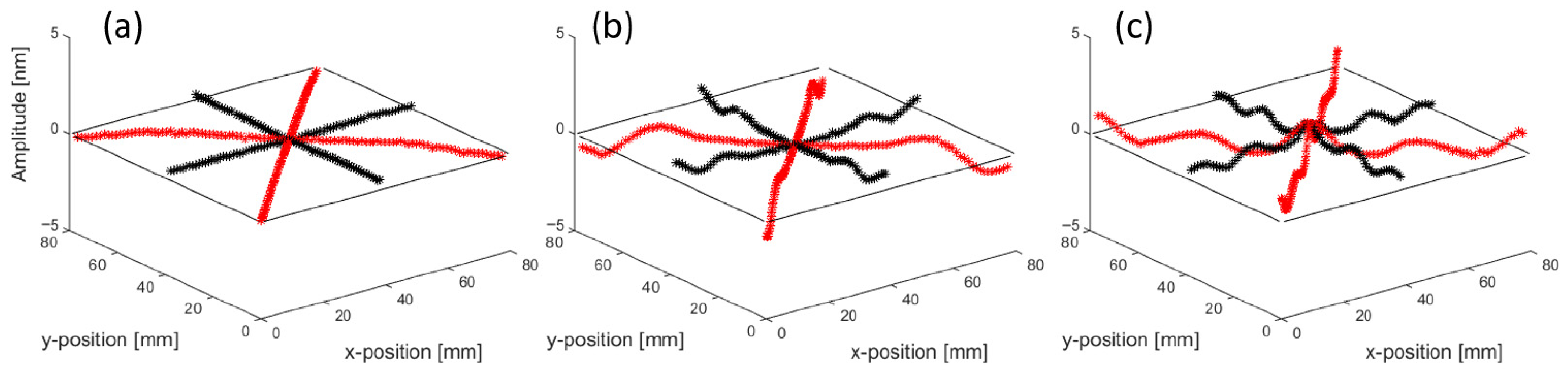 Figure 7b, wavefronts’ surface displacement of 0.5 nm). The cross-pattern observed in