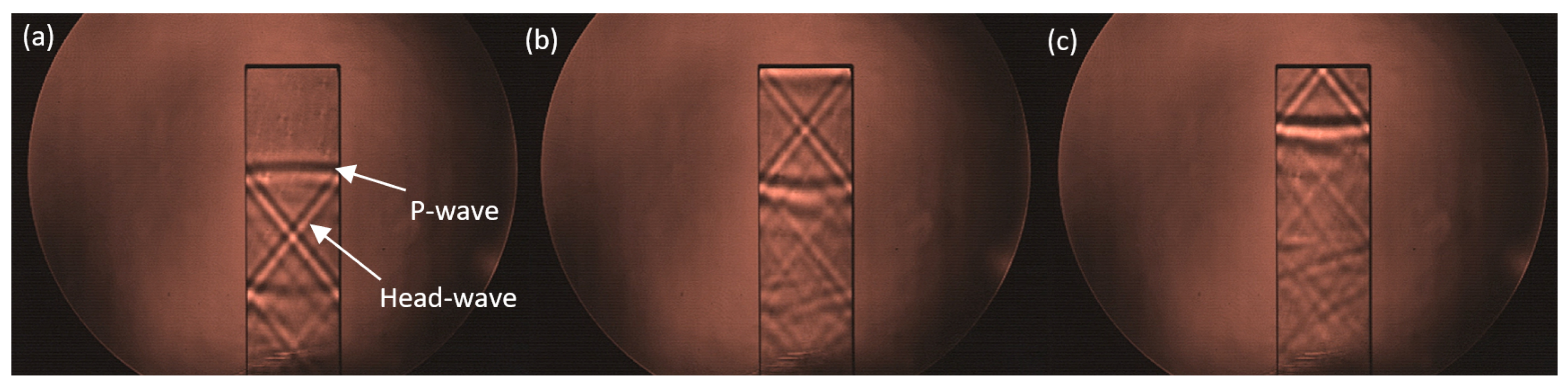 The images captured with the photoelastic system confirm the character of the UT pulse propagating through the glass specimen. As shown in