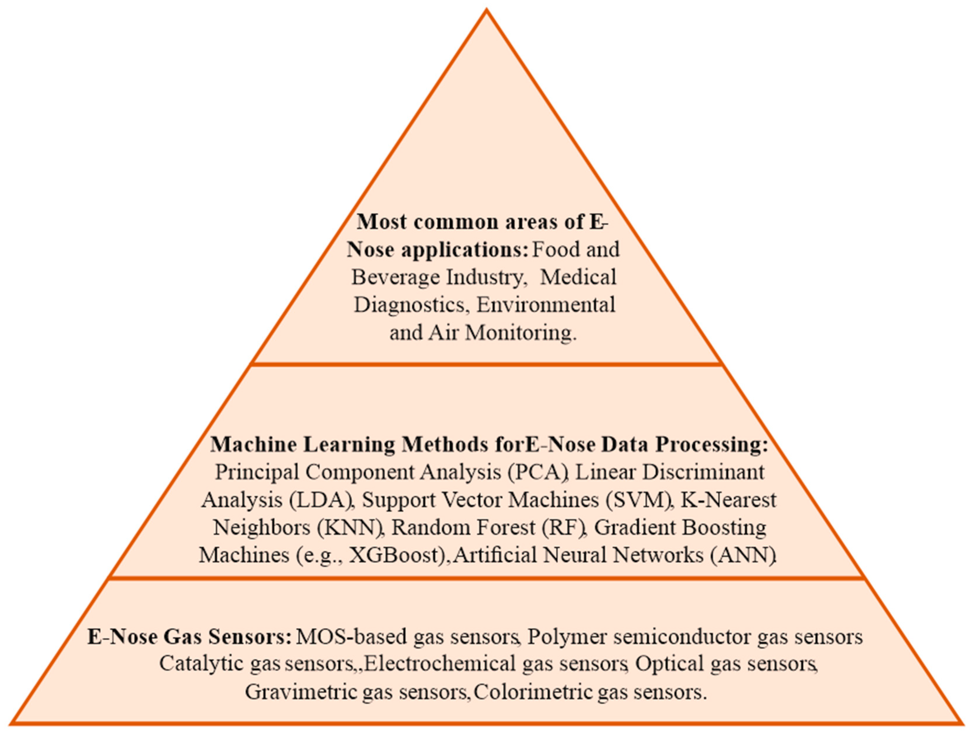 - The trends in e-noses from the last five years include innovations in integration of artificial intelligence and machine learning in their structure as deep neural networks and ML methods as Random Forests, XGBoost, KNN, and Nave Bayes. Other trends include the increasing use of IoT and edge computing. For the processing of data from e-nose sensors, specialized neuromorphic chips and TPUs (Tensor Processing Units) can be used. Other trends are innovations in the field of sensor materials such as specialized polymers. All mentioned above trends lead to miniaturization of e-nose systems, improving their accuracy and making them a real low-cost alternative of specialized measurement equipment in the fields of healthcare, food industry, and environment monitoring.