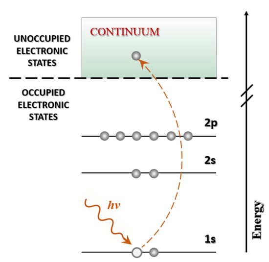 The ability of X-ray radiation to penetrate matter depends strictly on its energy; therefore, it is divided into three regimes: soft X-rays (<2 keV), tender X-rays (2–6 keV), and hard X-rays (>6 keV) [11]. This phenomenon involves the ejection of a core-level electron (e.g., from the 1s, 2s, or 2p orbital) when the energy of the incident photon equals or exceeds its binding energy. As a result of the absorption of the entire photon energy, an electron from the core level is ejected to a higher, unoccupied state or into the continuum. Figure 1 presents a diagram of the photoelectric effect, illustrating the absorption of X-ray radiation and the excitation of an electron from the K-shell. This process is accompanied by the attenuation of the intensity of the radiation beam, which will vary depending on the energy of the incident radiation.