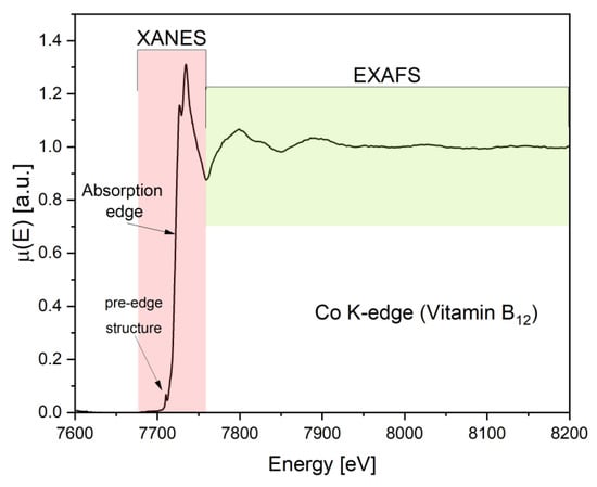 In the X-ray absorption spectrum, two main regions can be distinguished: X-ray absorption near-edge structure (XANES) and Extended X-ray Absorption Fine Structure (EXAFS) [16]. An exemplary XAS spectrum for the cobalt K-edge, measured for vitamin B12, is shown in Figure 3. The near-edge region (XANES) comprises pre-edge features, the white line corresponding to the 1s → p transition, and post-edge resonances that are highly sensitive to the oxidation state and local symmetry. At higher energies, the extended region (EXAFS) contains oscillations resulting from photoelectron scattering by neighboring atoms, which provide quantitative information on interatomic distances, coordination numbers, and structural disorder. Together, these two regions offer complementary insights: XANES reflects electronic structure, while EXAFS enables precise determination of local geometry. It is worth noting that the fine structure observed in XAS, comprising both the XANES and EXAFS regions, is commonly referred to in the literature as X-ray Absorption Fine Structure (XAFS). The term XAS refers to the method of obtaining these spectra.