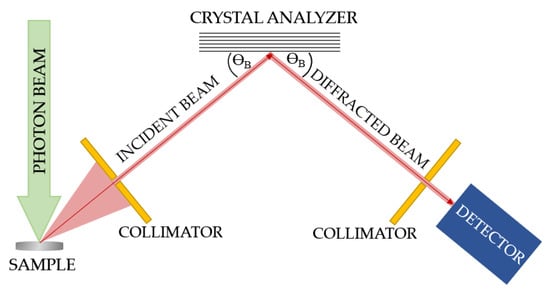 A typical setup for XES measurements consists of a sample, a crystal analyzer, and a detector arranged to optimize the detection of characteristic fluorescence lines emitted following core-level excitation. Crystal analyzers use Bragg’s law of diffraction to selectively reflect X-ray photons of specific energies, enabling high-resolution energy dispersion of the emitted fluorescence [31]. Figure 4 presents a schematic diagram of the operation of a flat single-crystal spectrometer.