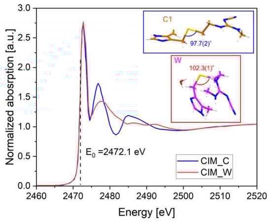 S K-edge XANES spectra of CIM_C (blue) and CIM_W (red) crystals and their structural formulas [76]. The same energy value for the absorption edge (E0—2472.1 eV) means that sulfur has the same oxidation state in each sample. The most pronounced changes in the spectra were observed in the energy range of 2474.0–2484.0 eV. The figure was reprinted with permission from Suzuki et al., “Analysis of Cimetidine Crystal Polymorphs by X-ray Absorption Near-Edge Spectroscopy”, Molecular Pharmaceutics, Copyright 2023 American Chemical Society.