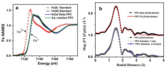(a) XANES spectra of iron(II) and iron(III) standards, along with FPC in both solid and solution phases, demonstrate that FPC contains exclusively iron(III) and that its solid-phase structure is preserved in solution. (b) EXAFS analysis of FPC in the solid state and in solution is shown for both Day 1 and Month 4. The figures were reproduced from [80].