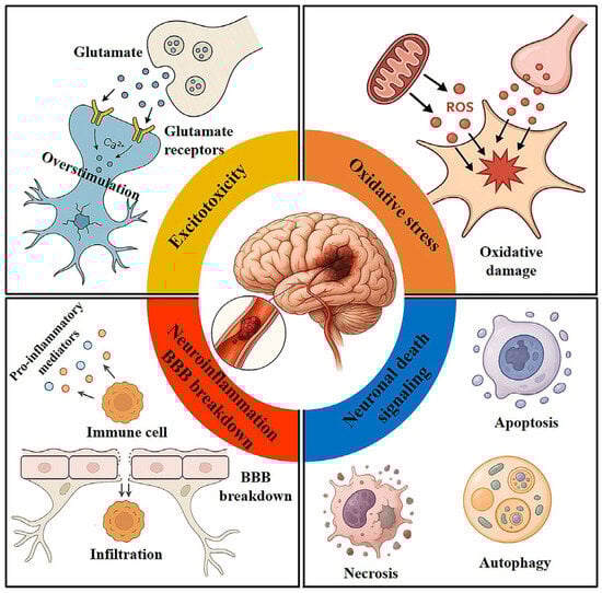 Cerebral ischemia, predominantly caused by thrombotic or embolic stroke (ischemic stroke), constitutes a leading cause of death and long-term adult disability worldwide [1]. This pathological condition is characterized by a significant reduction in cerebral blood flow, resulting in insufficient delivery of oxygen and nutrients to the brain tissues [2]. Due to the brain’s substantial metabolic demand and limited energy reserves, it exhibits an inherent vulnerability to ischemic damage [3]. The brain’s heightened susceptibility to ischemic injury provides the context for understanding how energy failure rapidly initiates a sequence of secondary pathological processes. The primary ischemic event in the brain triggers a complex and detrimental cascade of pathophysiological events, including excitotoxicity, oxidative stress, blood–brain barrier (BBB) breakdown, neuroinflammation, and ultimately neuronal death [4,5,6]. These intricate events not only precipitate immediate neuronal damage but also paradoxically exacerbate secondary injury following reperfusion, compounding the overall neurological deficit [7,8].