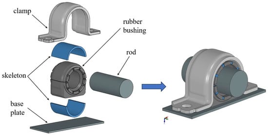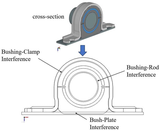 SolidWorks(2016) is used to create a 3D model of an Anti-roll Bar. The Anti-roll Bar mainly consists of five parts: clamp, rubber bushing, skeleton, rod and base plate. The assembly relationship is shown in Figure 1. The rubber bushing has interference with the rod, the clamp, and the base plate. In this paper, the interference between the bushing and rod is the radius interference value. The size of the interference is determined by the geometric position of the rubber bushing and the parts modeled in the geometric model. The range of variation in the interference amount is set according to the parameter requirements of a factory, and the interference part of the bushing is shown in Figure 2. The range of variation is shown in Table 1. The lower limits of the interference fits for these three interfaces are designed to ensure sufficient static friction between the bushing and the components, preventing relative slippage and noise under torque. The upper limits are constrained by the maximum allowable installation strain of the rubber material and assembly feasibility, thereby avoiding permanent damage to the rubber during the press-fit process.