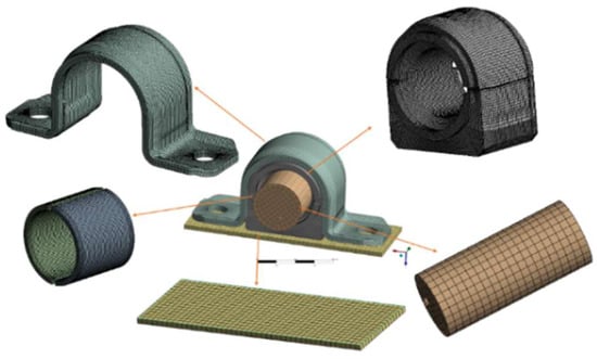 The 3D model of the anti-roll bar was simplified and meshed in Hypermesh. The number and size of mesh elements directly impact the efficiency and accuracy of the final solution, making mesh generation critical. To overcome volume locking phenomena in finite element simulations of rubber materials, the C3D8R element type was employed. For computational efficiency, the rubber bushing, clamp, and skeleton were meshed with a 1 mm element size, while other components used a 2 and 3 mm-mesh size. The resulting mesh, shown in Figure 3, comprised 172,585 elements and 138,005 nodes.
