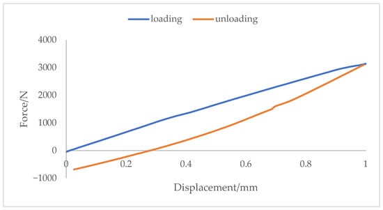 Rubber materials exhibit hyperelastic characteristics. To verify that the Mooney–Rivlin two-parameter model can capture the nonlinear behavior of rubber, the material parameters mentioned earlier were used to simulate the loading and unloading of a rubber bushing under 1 mm displacement. The resulting force–displacement curve is shown in Figure 4. Both the loading and unloading stages display significant nonlinearity. Moreover, the loading and unloading paths do not coincide, indicating a hysteresis effect. Therefore, the Mooney–Rivlin two-parameter model is capable of capturing the nonlinear behavior of rubber.