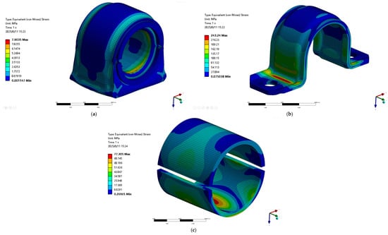 Stress cloud map of important components under interference fit conditions; (a) Rubber bushing stress, (b) Clamp stress, (c) Skeleton stress.