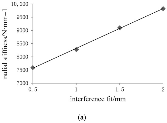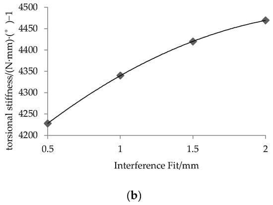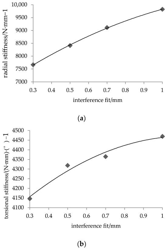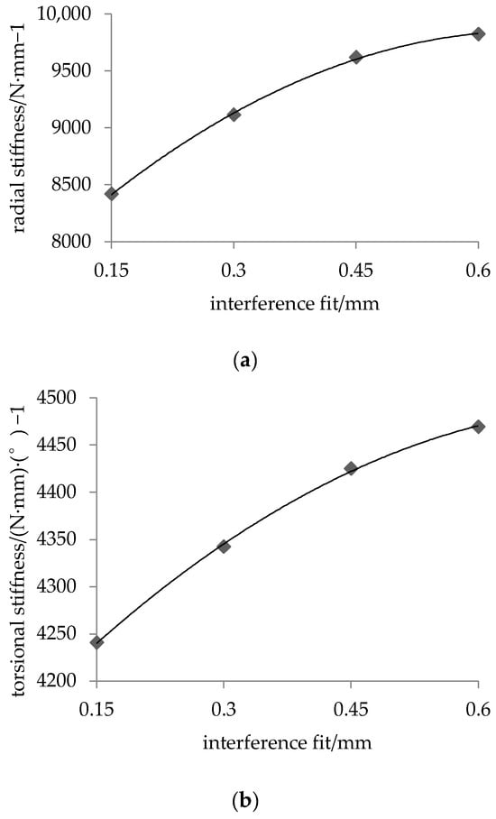 Stiffness and Interference fit between the bushing and rod variation relationship curve; (a) Relationship between radial stiffness and changes in bushing and rod interference fit, (b) Relationship between torsional stiffness and changes in bushing and rod interference fit.