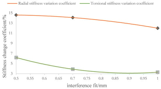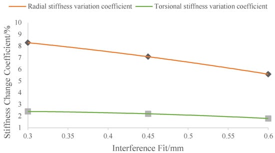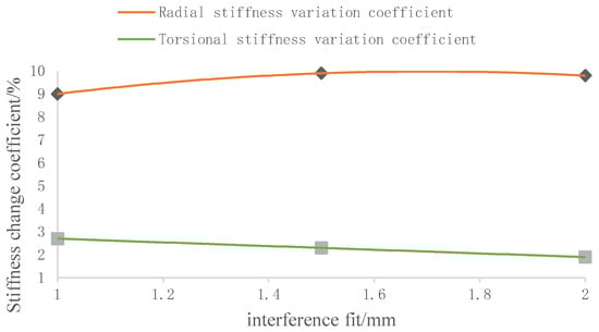 is defined as 0.3 mm, and is the stiffness value at this interference level. The stiffness variation coefficient for both radial and torsional stiffness can then be obtained using Equation (6). Figure 7 shows the relationship between this coefficient and the change in interference at the bushing and rod interface.