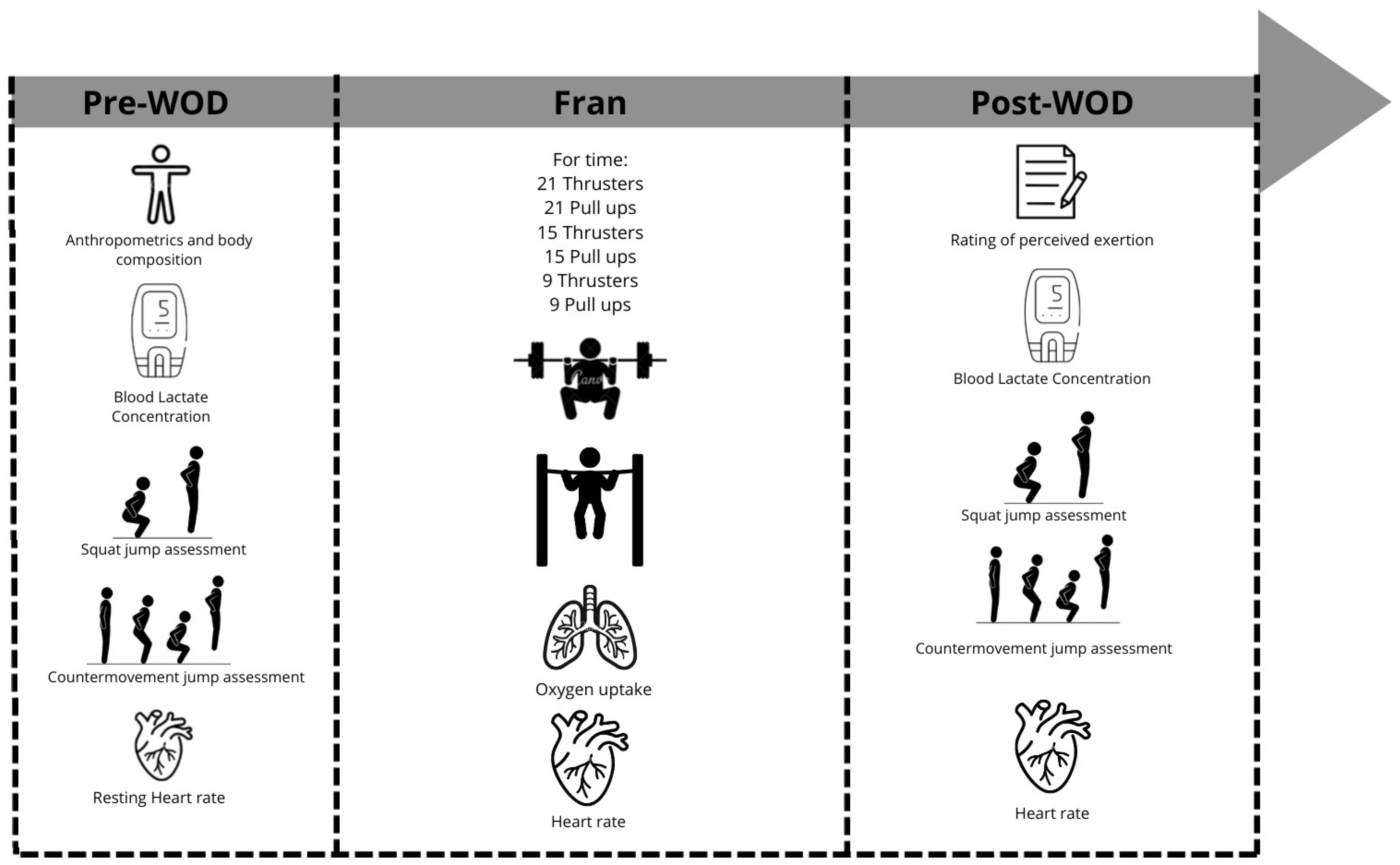 Figure 2. Schematic representation of the experimental protocol. Assessments were conducted pre-WOD (anthropometrics, body composition, blood lactate concentration, squat and countermovement jump performance, resting heart rate), during the benchmark CrossFit workout Fran (respiratory gas exchange, heart rate), and post-WOD (rating of perceived exertion, blood lactate concentration, squat and countermovement jump performance, heart rate).