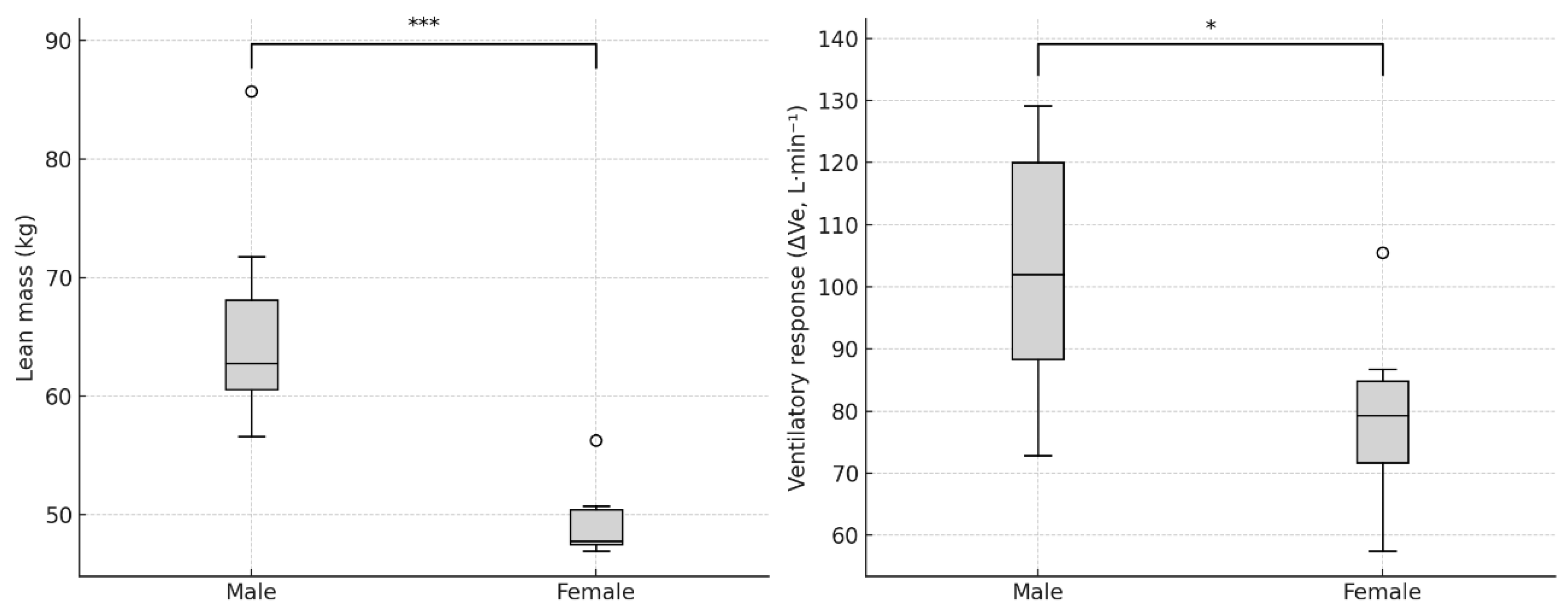 Figure 3. Boxplots (median, interquartile range, minimum–maximum, and outliers) of lean mass (kg) and ventilatory response (ΔVe, L·min−1) stratified by sex. Asterisks indicate significant differences (* p < 0.05; *** p < 0.001).
