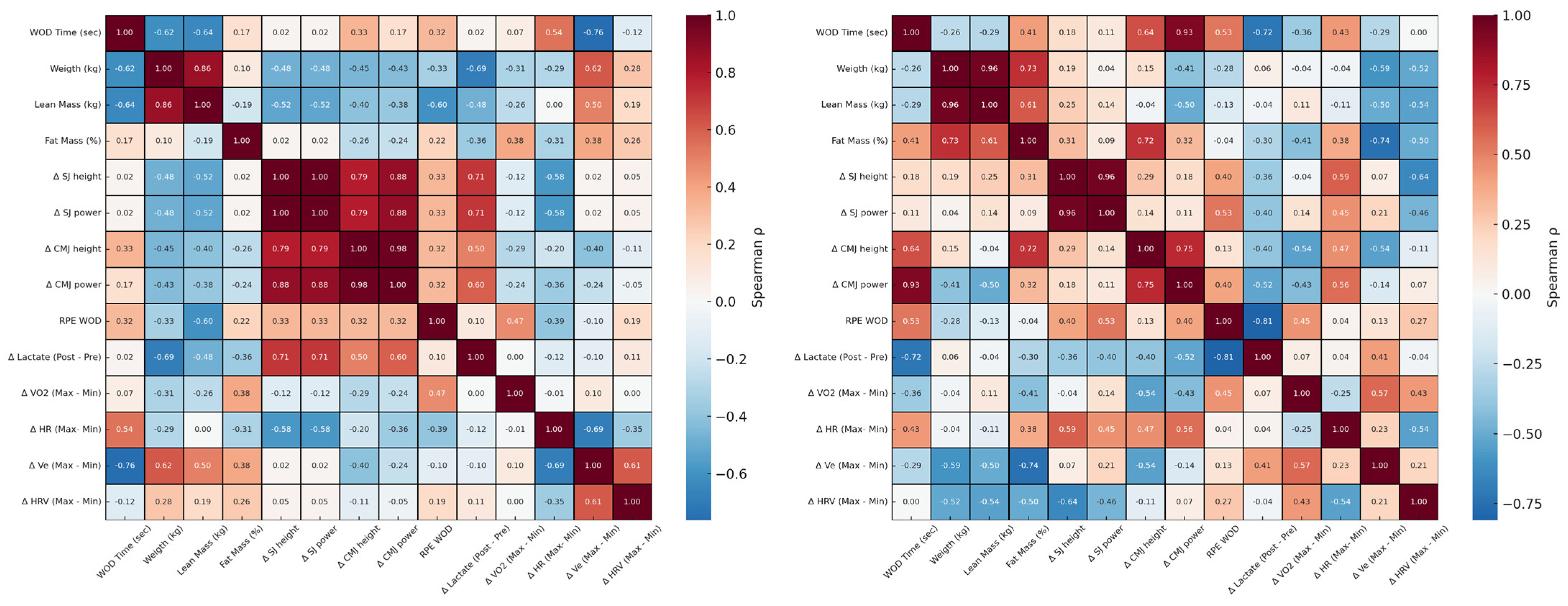 Figure 5. Spearman’s rank correlation coefficients (ρ) between physiological, biomechanical, and perceptual variables and workout completion time (WOD Time, s) for the total sample (n = 15). Color scale indicates direction and magnitude of correlations (blue = negative, red = positive). Numeric values represent correlation coefficients. Variables include body composition (weight, lean mass, fat mass), neuromuscular function (Δ squat jump [SJ] and countermovement jump [CMJ] height and power), perceptual responses (RPE), and physiological markers (Δ lactate, Δ VO2, Δ HR, Δ Ve, Δ HRV).