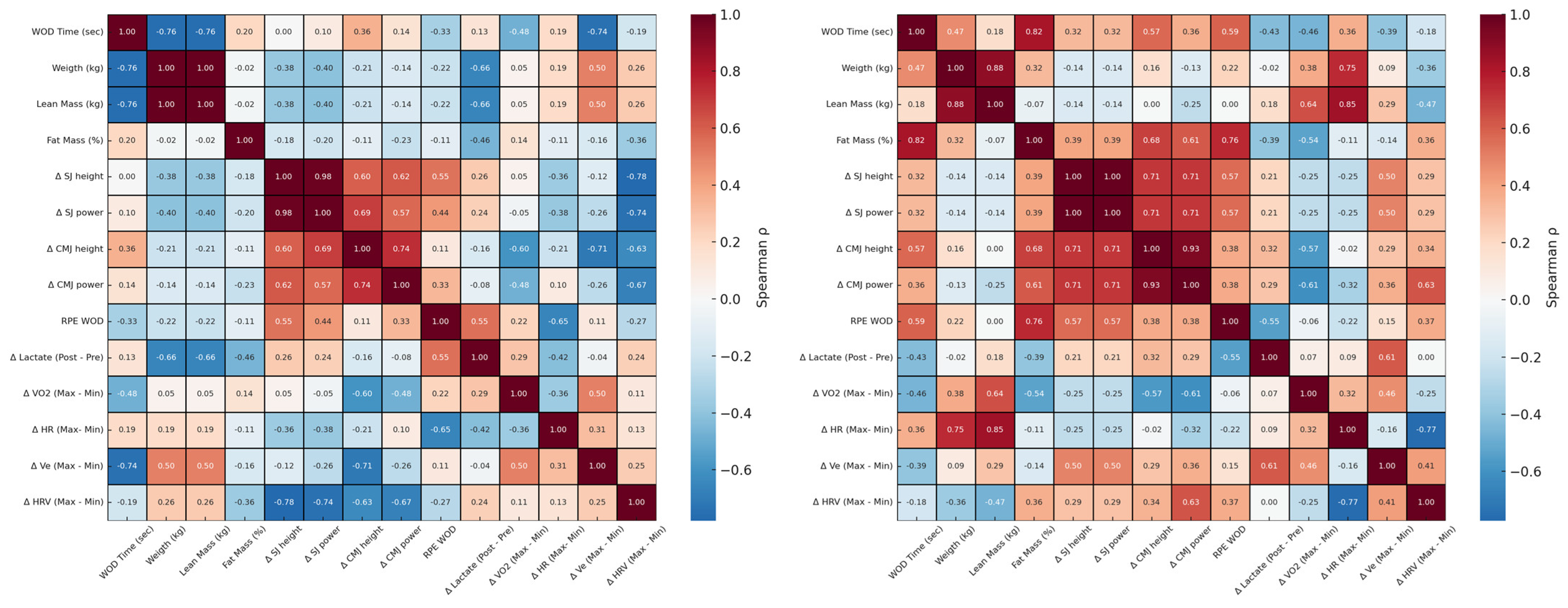 Figure 6. Spearman’s rank correlation coefficients (ρ) between physiological, biomechanical, and perceptual variables and workout completion time (WOD Time, sec), stratified by sex (Male: n = 8, left panel; Female: n = 7, right panel). Color scale indicates direction and magnitude of correlations (blue = negative, red = positive). Numeric values represent correlation coefficients.