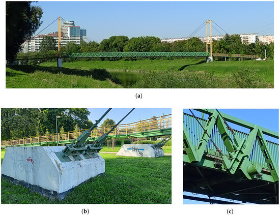The river crossing span length is 64.0 m. It is a steel frame with a structural height of 1.73 m. The lower chords of the girders are made of a 200 mm C-section, the upper chords of two 160 mm C-sections, and the diagonals are made of a 120 mm C-section. All members of the two girders are connected by welding, and the middle surface of the diagonals is offset from the middle surfaces of the chords (Figure 1c). The crossbeams are made of a 200 mm I-section spaced 2.0 m apart and are braced (X-type) with 60 mm × 60 mm × 6 mm angle sections. The total width of the space frame is 3.08 m. The structure of the deck has been modified from the originally designed version. Currently, four timber beams lie along the footbridge on the crossbeams, with 5 cm-thick boards placed on them perpendicular to their axis. Steel handrails are mounted to the diagonals.