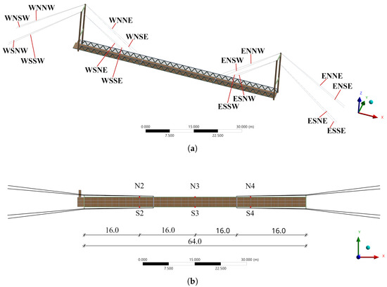 Scheme of pedestrian bridge over the Wisłok River in Rzeszów modeled in ANSYS. (a) General view with the description of cables names (WNNW, WNSW, etc.), and the directions of the Global Coordinate System (GCS). (b) Top view of the modeled object with the location of red points for displacement measurement in the static loading test.