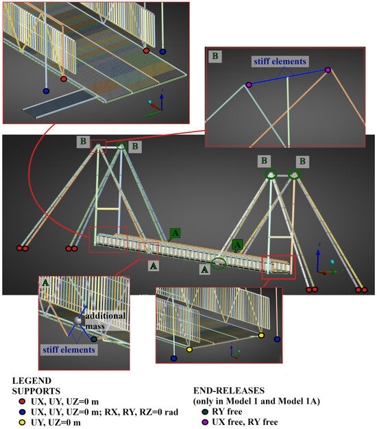Based on the available documentation, in which the slides on the heads of the pylons are mentioned, and the visual assessment of the span suspension in the first model, the end releases are applied (Figure 4): (1) On the pylons, the movement of cables along the foobridge axis (X in GCS) as well as the rotation around the pylons (Y in GCS), and (2) on suspension, rotation around the suspension beam (Y in GCS). However, during the examination, free movement in the mentioned directions appeared to be limited, and finally, both situations—with and without end releases—were considered as shown in Table 1, upper row.