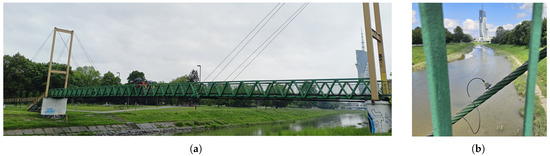 For the study, the cable-stayed footbridge over the Wisłok River along Podwisłocze Street in Rzeszów (Poland) was selected (Figure 1). The structure is very commonly used by pedestrians and bicyclists; it connects a residential estate of several thousand inhabitants (on the east side of the river) with the city center (on the west side). Additionally, it is located in the green recreational areas, which makes it attractive for people who would like to take a rest away from the hustle and bustle of the streets. Unfortunately, the footbridge is highly susceptible to dynamic excitations caused by pedestrians, which makes the structure interesting from a scientific point of view; however, the comfort of usage for many pedestrians is very low.