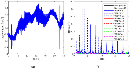 (a) Raw acceleration signal registered on WNNW, excitation—background. (b) Signals registered for WNNW after transformation into the frequency domain, taking into account the location of the source of excitation; e.1, e.2, e.3 refers to the excitation number on the selected cable.