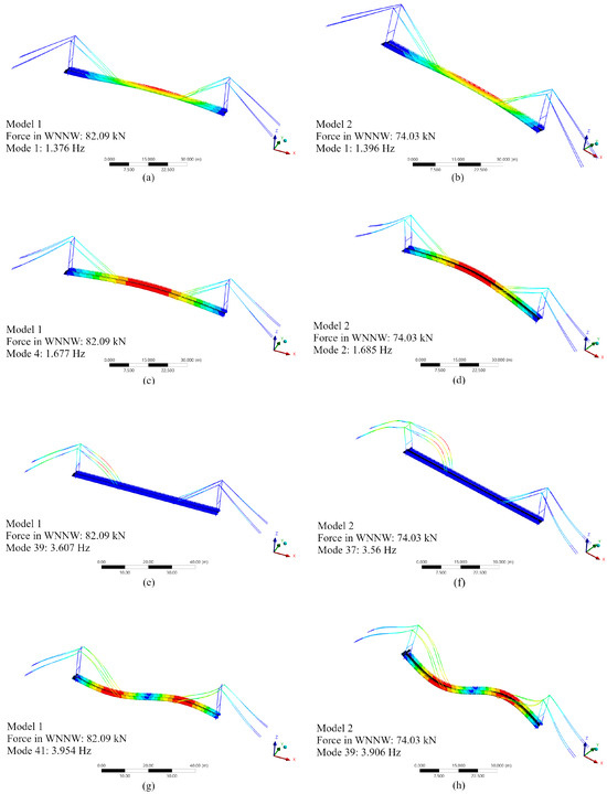 Modal frequencies and mode shapes were calculated. In total, 26 cases were analyzed: two model types and thirteen pre-tension states for each. Selected global mode shapes for systems with cable tensions corresponding to the footbridge grade line are shown in Figure 7a,c,e,g for Model 1, and in Figure 7b,d,f,h for Model 2. All global modes for the main span were identified; however, their modal ordering differed between models. This was due to different pylon behavior. In Model 1, local modal forms associated with the pylons appeared (e.g., Figure 8), which were not present in Models 2 and 2A. Modal similarity was assessed visually and using the Modal Assurance Criterion (MAC) [52]. The correlations of forms shown in Figure 7 are presented in Table 5. As shown, the global forms for the main span were nearly identical (MAC ≈ 1.0), whereas similarity decreased for local modes.