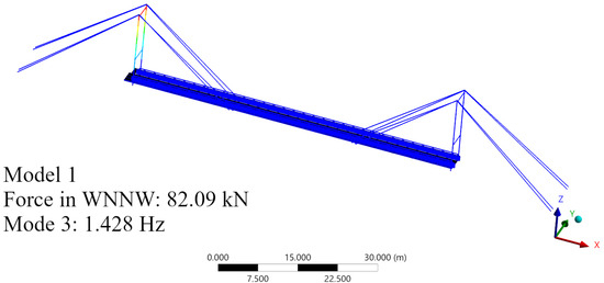 Frequencies corresponding to the global modes of the main span did not differ significantly regardless of cable force. The frequencies of the first two modal forms are shown in Table 6. Compared with the natural frequencies reported in [59], the numerical values differed within . It should be noted that those measurements were taken before renovation and deck replacement, which may have altered the structure’s mass and hence its natural frequencies.