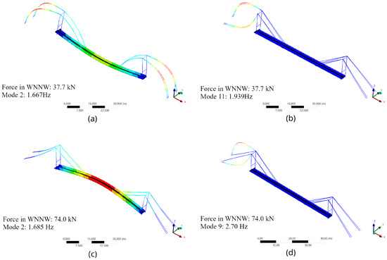 Cable pre-tension had the strongest impact on cable mode shapes and corresponding frequencies. Figure 9 illustrates this effect for the model without end releases on pylons and suspension elements. Figure 9a,c show the first global vertical form. The mode shapes appear similar despite opposite phases. However, closer inspection reveals that for low pre-tension (Model 2A, Figure 9a) dominant amplitudes occur in the cables, whereas for higher pre-tension (Model 2, Figure 9c), the maximum vertical displacement is near the midspan of the main span.
