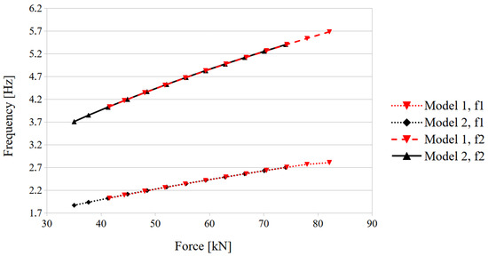 The influence of force increment on the first two natural frequencies in the case of cable WNNW and the model with and without end releases is shown in Figure 10. Forces in cables result from imposed temperature changes used to simulate pre-tension and the adopted static scheme (see Section 2.2 and Table 1). In a certain range of axial force in the cable, both models produced the same natural frequency value. This may explain why the precise identification of the proper numerical model is so difficult. It is still important to remember that these relations are prepared for a uniform increase in force in all cables. This issue requires further research, especially taking into account the conclusions from the previous paragraph.