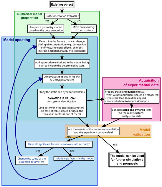 Every structure is a unique system (at least due to the real boundary conditions in supports, or material structure, which is not perfect). There is no one rigid procedure to successfully develop numerical models of a degraded footbridge, but some universal recommendations are specified in the flowchart (Figure 11). All the steps from the first numerical model preparation, planning, and conducting the experiment, model validation, and updating have to consider both static and dynamic parameters (which are crucial for cable-stayed pedestrian footbridges). Various updating techniques exist in the literature; for FEM models of cable-stayed footbridges, methods such as evolutionary game theory [65] or polynomial chaos expansion-driven Bayesian inference [66] may be helpful.