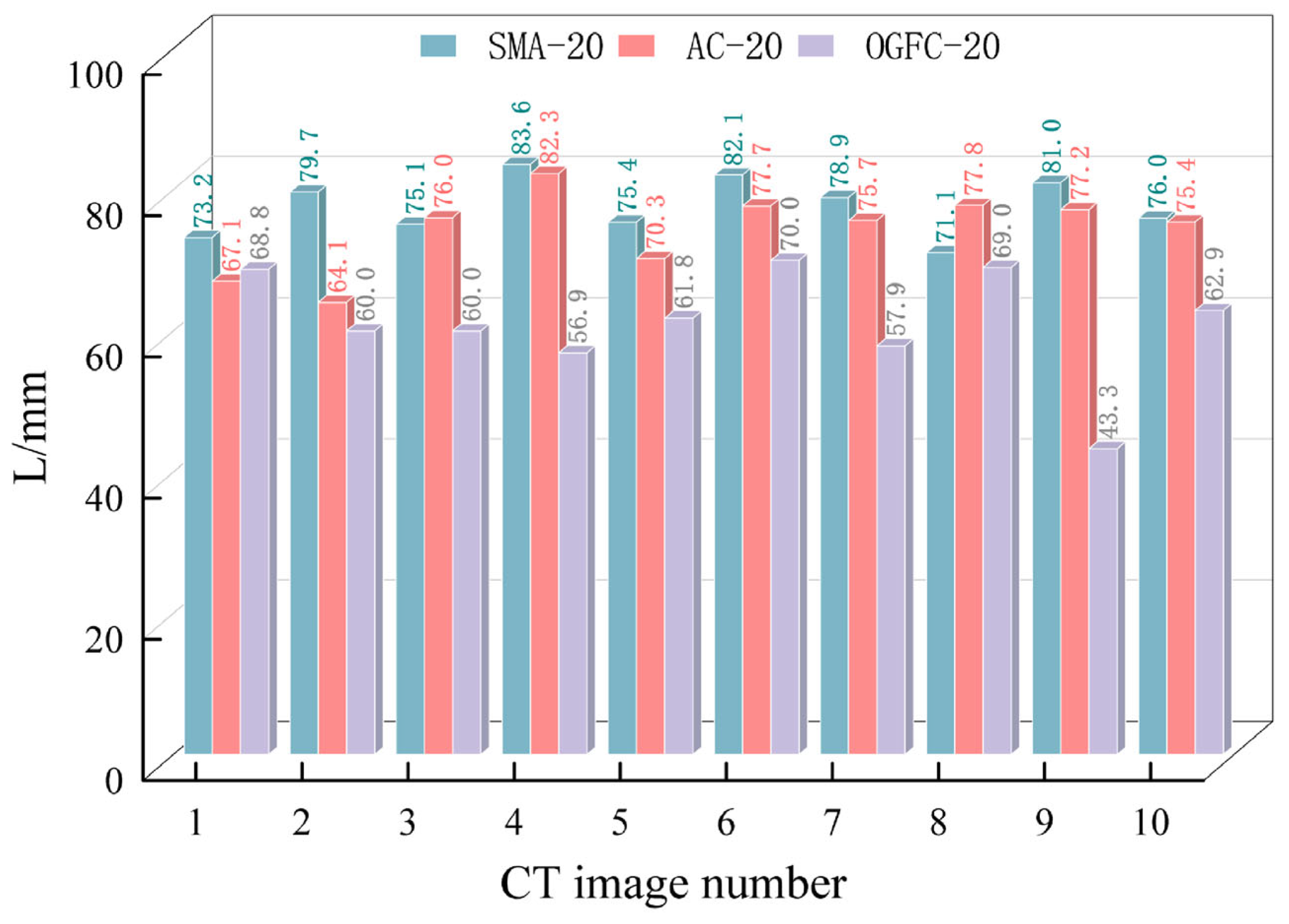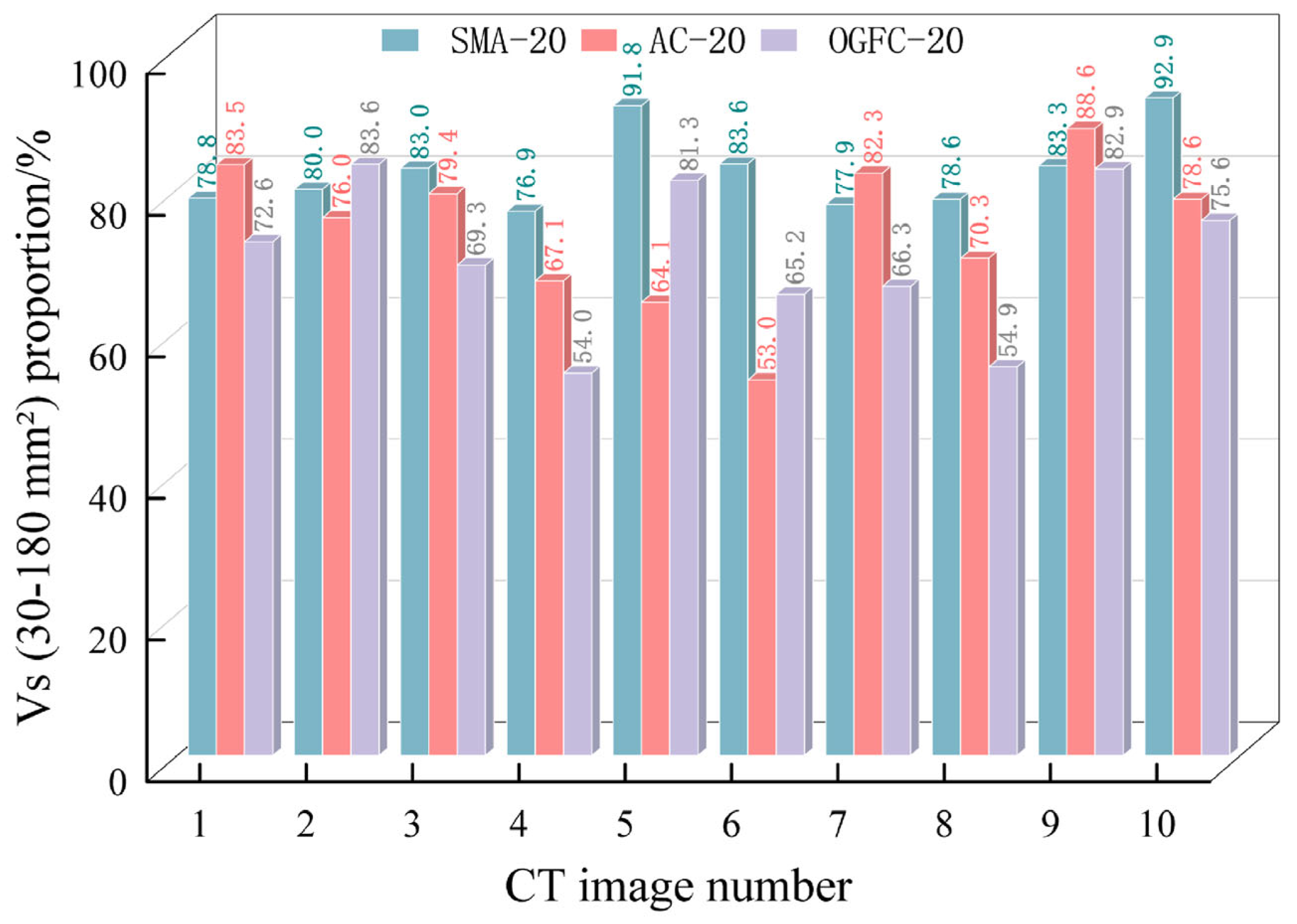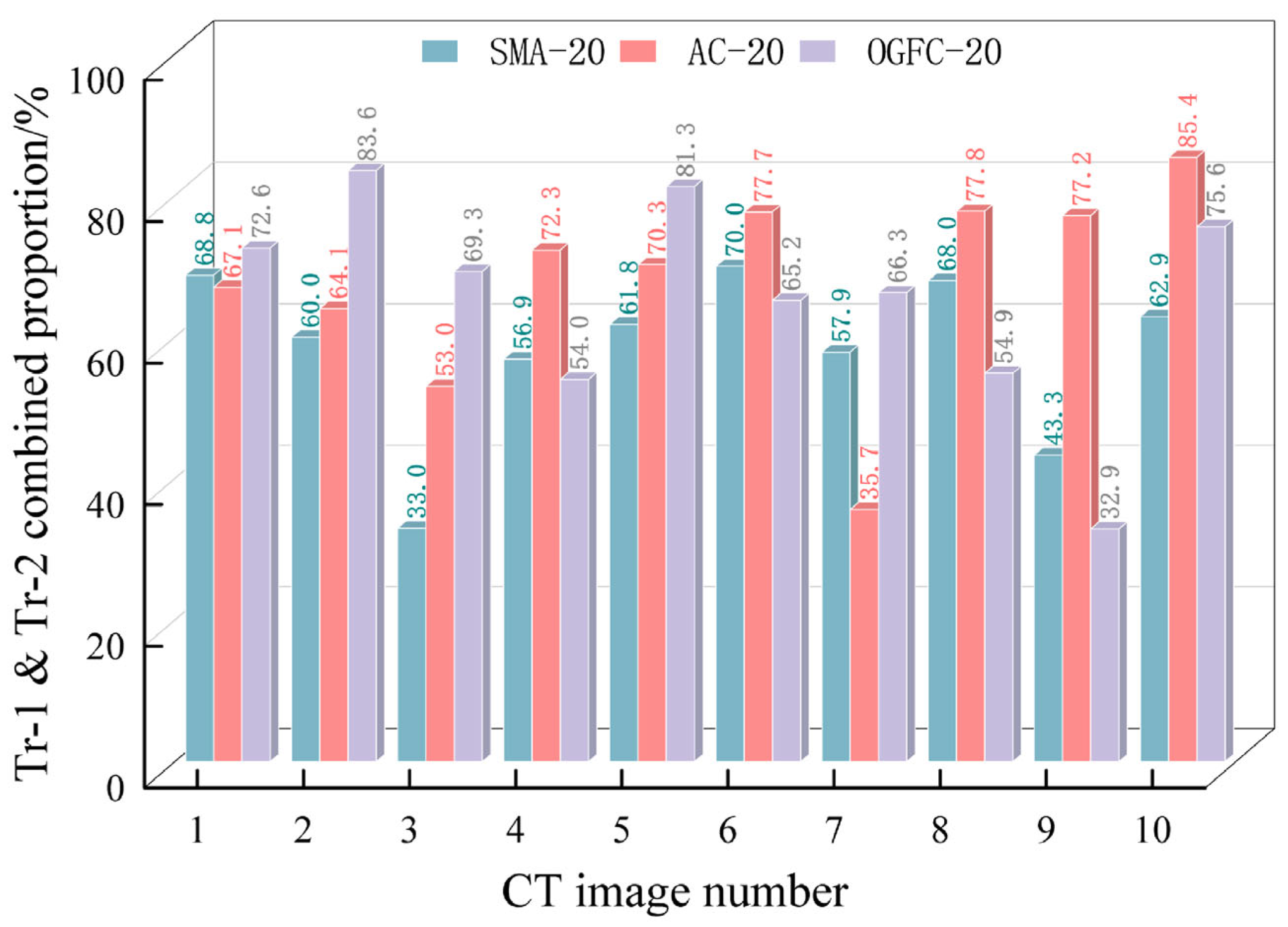 - The displacement of coarse aggregates under loading was significantly influenced by the skeletal contact characteristics of the asphalt mixture. The results indicated that only 8.6% of coarse aggregates in SMA-20 exhibited a movement range of 1.2–1.8 mm, meaning the majority showed minimal movement. Similarly, only 9.3% of coarse aggregates in OGFC-20 moved within the 1.2–1.8 mm range. In contrast, AC-20 exhibited a significantly higher proportion, with 21.8% of coarse aggregates moved within the range of 1.2–1.8 mm. Consequently, the coarse aggregates in AC-20 demonstrated the largest magnitude of displacement under loading, indicating that its skeletal structure was comparatively weaker than those of SMA-20 and OGFC-20. A well-interlocked skeletal structure formed by a high proportion of coarse aggregates can effectively enhance the long-term stability of the asphalt mixture, reduce coarse aggregates movement under sustained loading, and improve resistance to cracking.