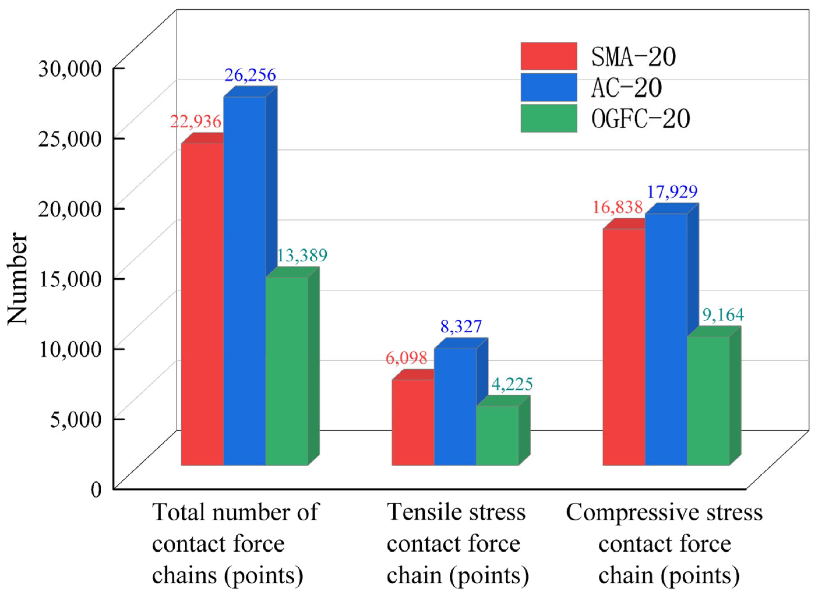 - In the skeletal structure of asphalt mixtures, contact points experience compressive stress, tensile stress, and combined tensile-compressive stress. Within the loaded area, aggregate interactions were predominantly compressive stress, while both compressive and tensile stresses coexisted in regions on both sides of the loading zone. Under loading, AC-20 exhibited the lowest number of long and thick contact force chains among its coarse aggregates, so the skeletal interlocking structure formed by AC-20 was relatively weak. In contrast, OGFC-20 and SMA-20 developed more complete skeletal interlocking structures, enabling them to withstand higher stress levels. For all three gradations, compressive stress contact force chains (points) accounted for over 65% of the total contact force chains (points), indicating that the skeletal system of asphalt mixtures primarily bore and transmitted compressive stresses under splitting load conditions.