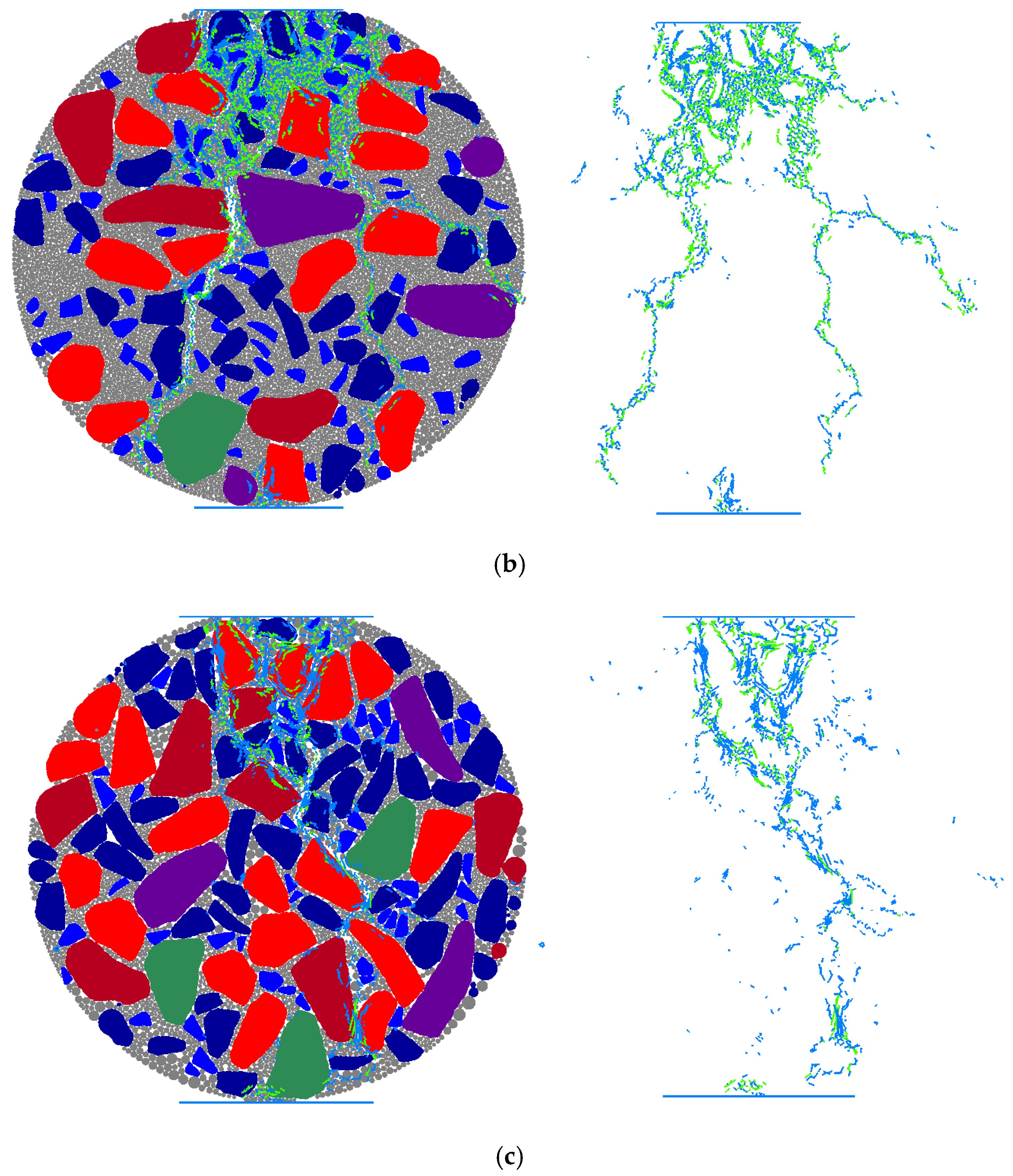 - Gradations with superior skeletal structures demonstrated greater advantages in reducing crack initiation. Under loading, the specimens primarily exhibited two typical micro-crack propagation modes: shear stress cracks and tensile stress cracks. Test results indicated that the number of shear stress cracks exceeded that of tensile stress cracks in all three gradations, with shear stress cracks accounting for over 55% of the total cracks in each case. This suggested that under splitting load conditions, the mixture experiences more damage due to shear failure than to tensile failure. The established DEM model effectively simulated the processes of crack initiation and propagation. Cracks predominantly occurred at three types of locations: fracture at coarse aggregate–coarse aggregate contact interfaces, debonding between asphalt mortar and coarse aggregates, and fracture within the asphalt mortar. Therefore, a uniform distribution of asphalt mortar and coarse aggregates, combined with an effectively interlocked coarse aggregate skeleton, can significantly enhance the crack resistance of asphalt mixtures.