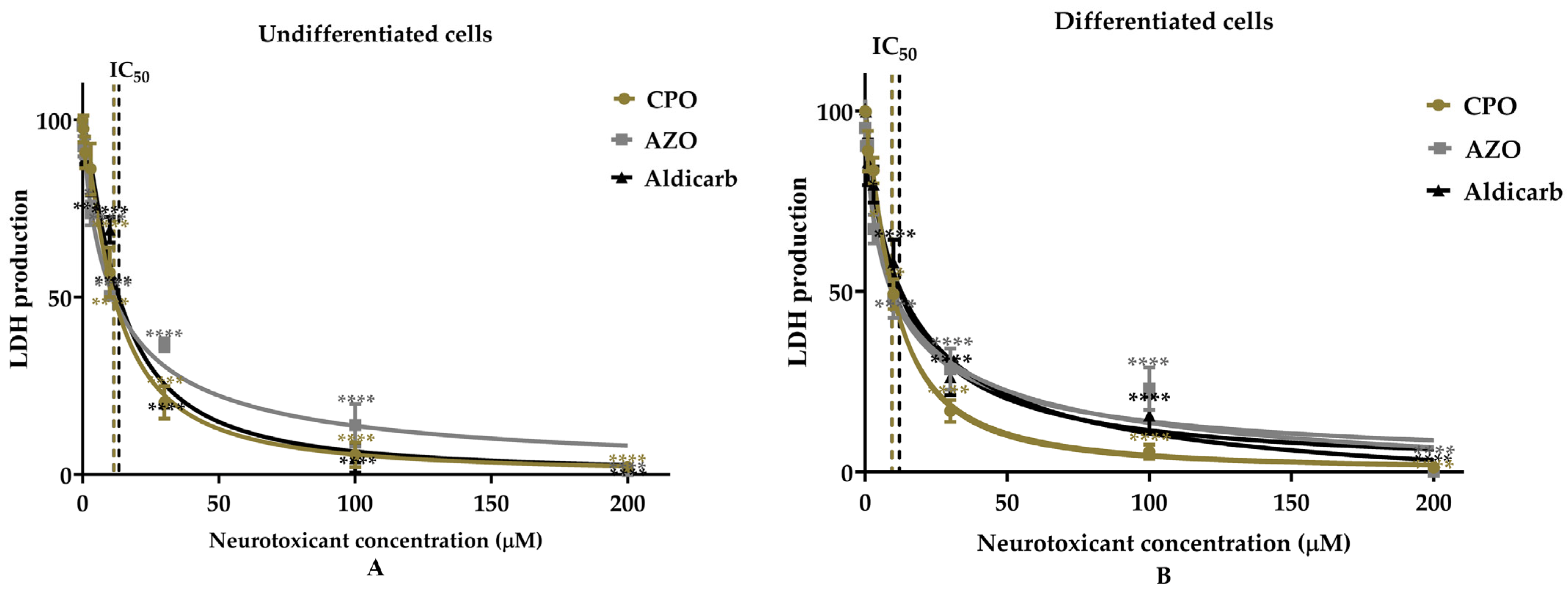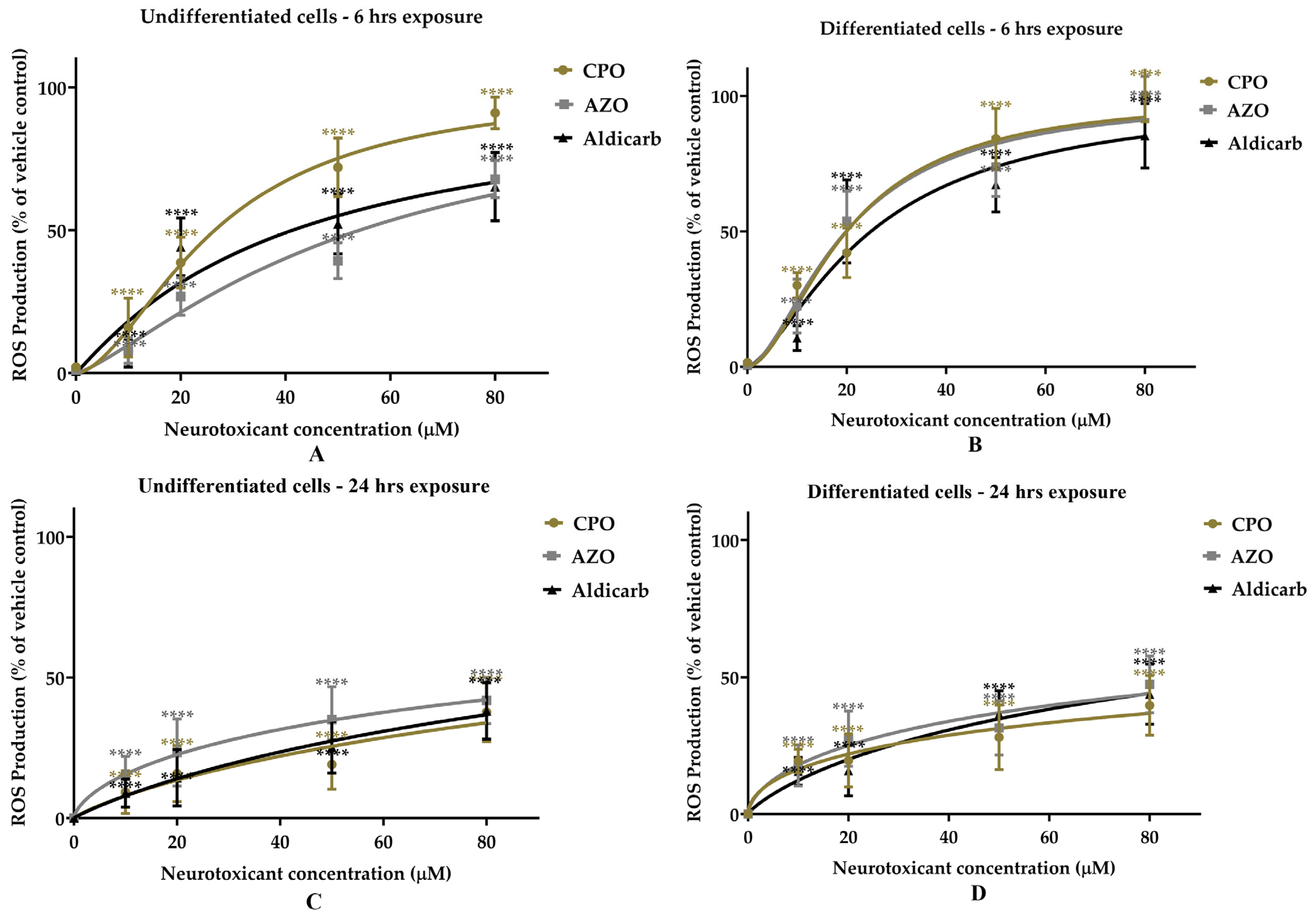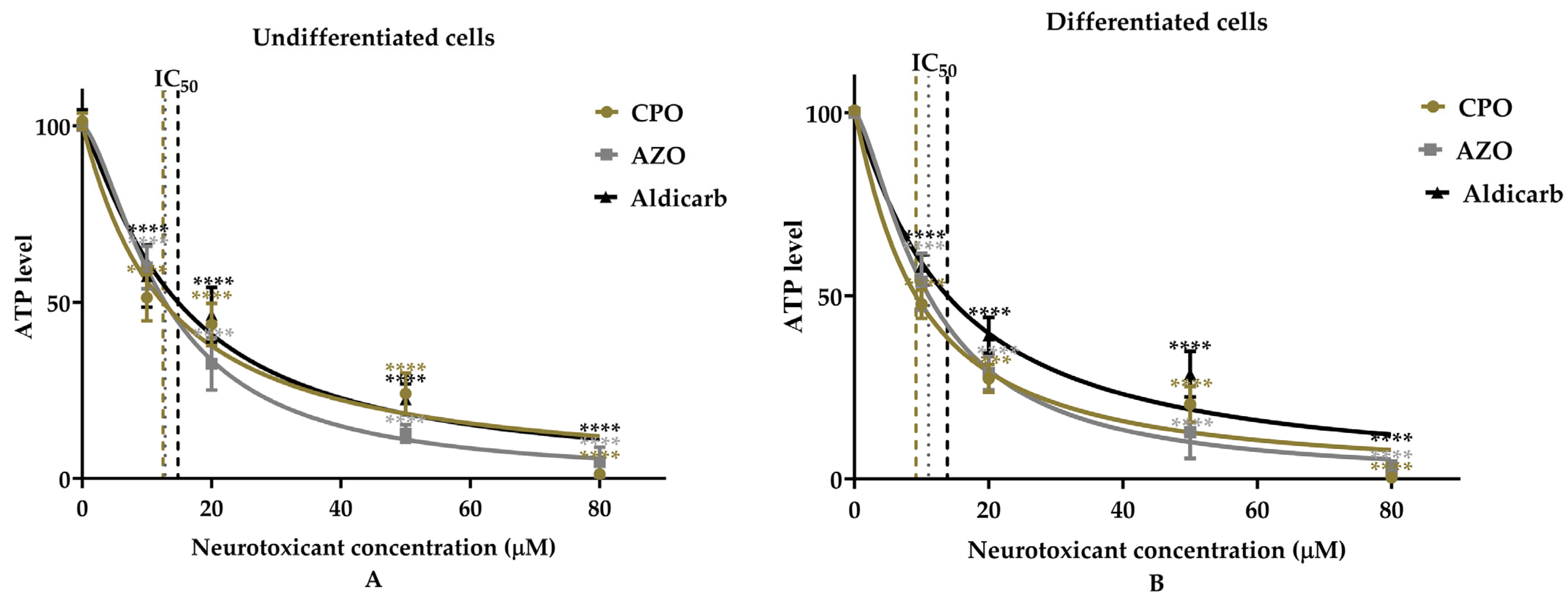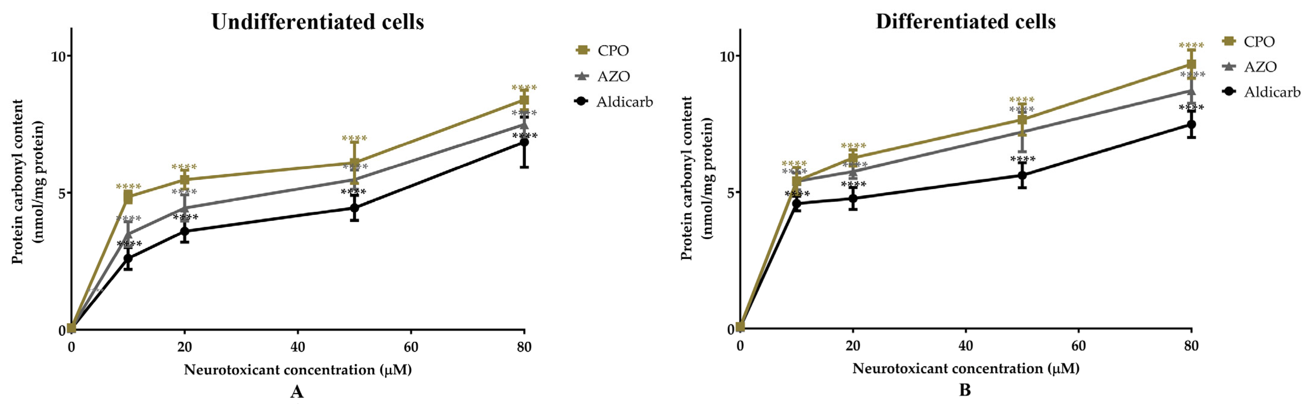 - Mudyanselage, A.W.; Wijamunige, B.C.; Kocon, A.; Carter, W.G. Differentiated Neurons Are More Vulnerable to Organophosphate and Carbamate Neurotoxicity than Undifferentiated Neurons Due to the Induction of Redox Stress and Accumulate Oxidatively-Damaged Proteins. Brain Sci. 2023, 13, 728. [Google Scholar] [CrossRef]