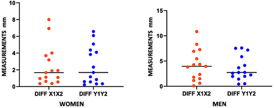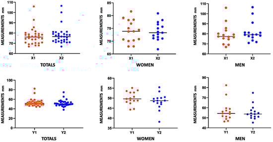 When analyzing the combined data for both sexes, the total X1 and X2 coordinates, representing the length of the mandibular body, did not follow a normal distribution (Shapiro–Wilk test: X1, p = 0.001; X2, p = 0.002).