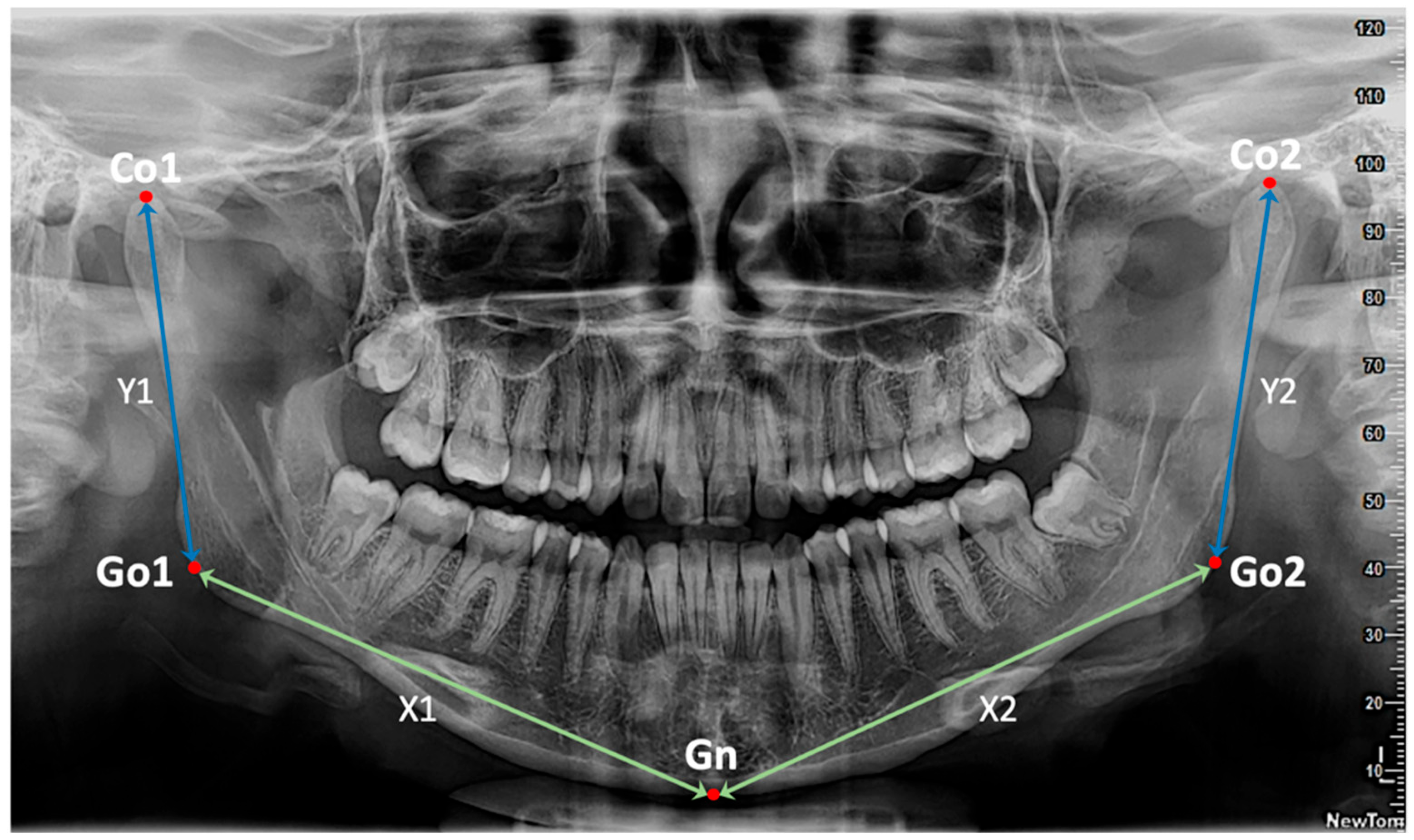 - Conversion and calculation of distances: the obtained coordinates were processed from the 5 anatomical landmarks (Co1, Go1, Gn, Go2, Co2) and representative linear measurements were extracted for the calculation of the 4 key Euclidean distances defined as, X1: distance between Go1 and Gn (right half of the mandibular body); X2: distance between Gn and Go2 (left half of the mandibular body); Y1: distance between Co1 and Go1 (right mandibular ramus); Y2: distance between Go2 and Co2 (left mandibular ramus). All obtained distances were converted from pixels to millimeters using a conversion factor specific to the analyzed images (0.10585 mm/pixel) (Figure 1).