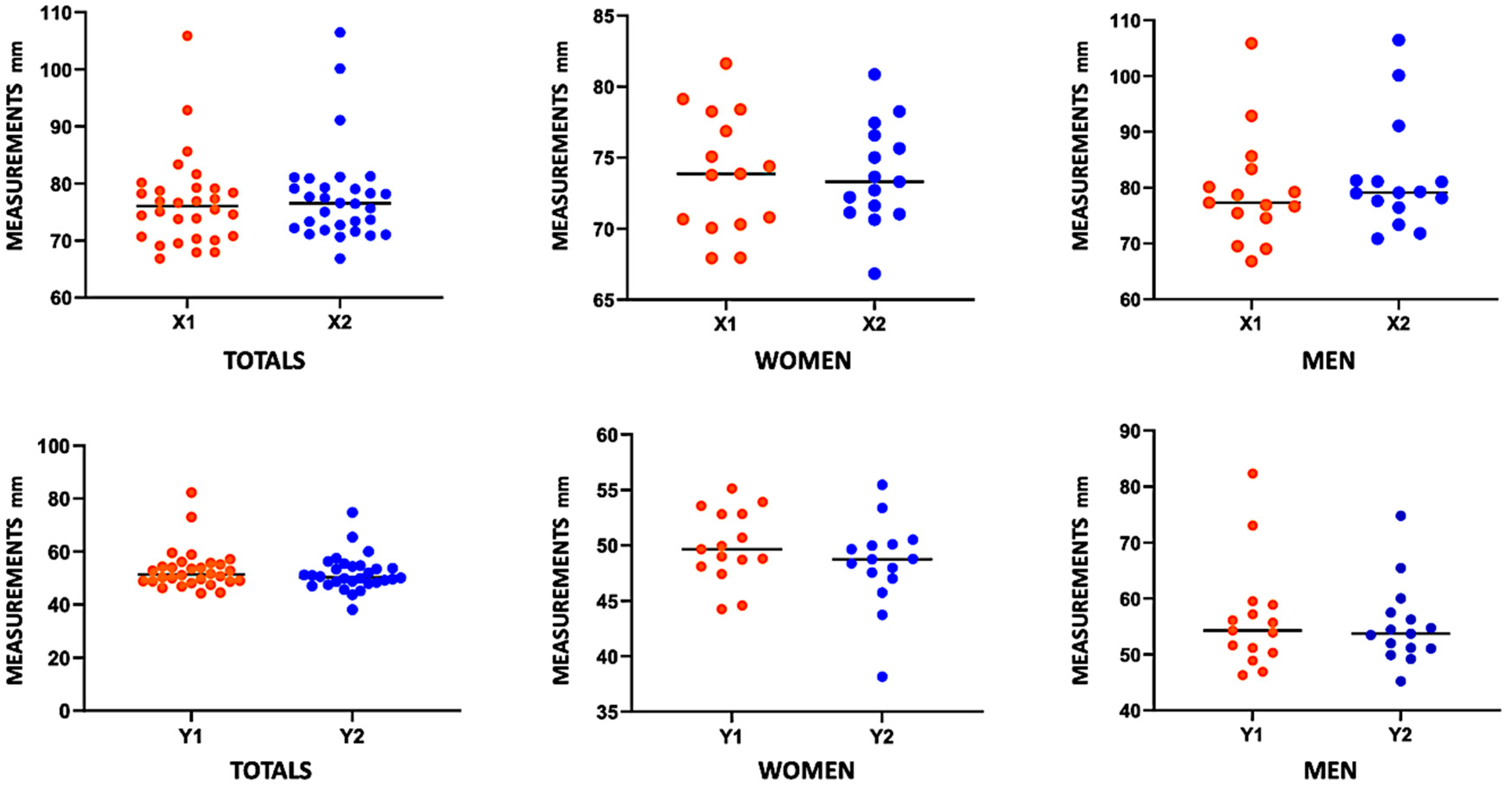 - Right side (X1): mean of 73.94 mm (range: 67.93 to 81.64 mm).