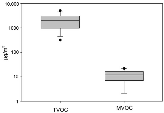 - Schleibinger, H.; Laussmann, D.; Bornehag, C.G.; Eis, D.; Rueden, H. Microbial volatile organic compounds in the air of moldy and mold-free indoor environments. Indoor Air 2008, 18, 113–124. [Google Scholar] [CrossRef]
