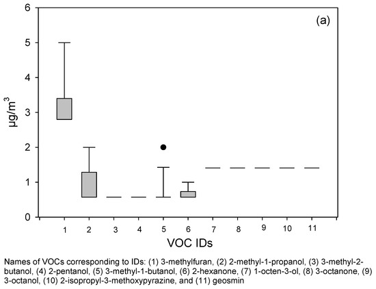 - Ryan, T.J.; Beaucham, C. Dominant microbial volatile organic compounds in 23 U.S. homes. Chemosphere 2013, 90, 1670–1674. [Google Scholar] [CrossRef]