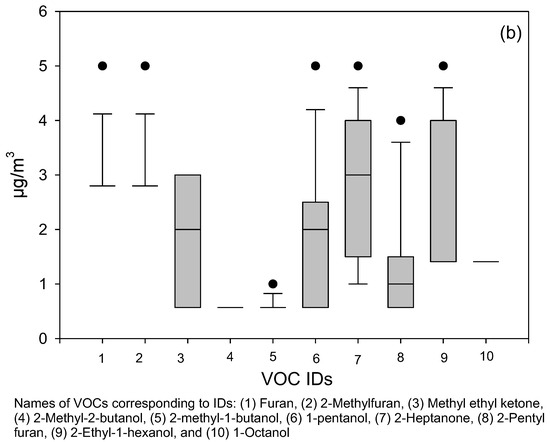 Box plots show (a) the distribution of data for 11 priority MVOCs (as reported by previous researchers) and (b) the other 10 MVOCs in sampled flood-affected homes. Altogether, 21 different MVOCs were analyzed. The lower and upper boundaries of the box specify the 25th and 75th percentiles, respectively. The line within the box indicates the median, and the whiskers above and below the box indicate the 95th and 5th percentiles, respectively.