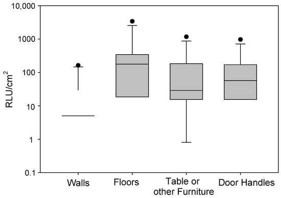 The distributions of microbial activity across different surfaces (floors, tables, door handles, and walls) are presented below in Figure 3. ATP bioluminescence assays revealed substantial variability in microbial activity across tested surfaces. Floors exhibited the highest median (IQR) activity (267, 225 RLU/cm2), followed by door handles (81, 128.75), tables (29, 111), and walls (12, 26.5) (all units are RLU/cm2). The elevated microbial load on floors is consistent with previous work demonstrating that floors act as major sinks for microbial deposition and resuspension [30]. Conversely, walls, which are less frequently contacted, showed the lowest ATP activity. These findings highlight that high-touch surfaces (e.g., tables, door handles) may serve as secondary reservoirs, sustaining microbial transfer between occupants and indoor environments, even when visual microbial growth is absent [31]. Floors showed the highest activity with a median of 267 RLU, highlighting their role as significant microbial reservoirs [30,31].