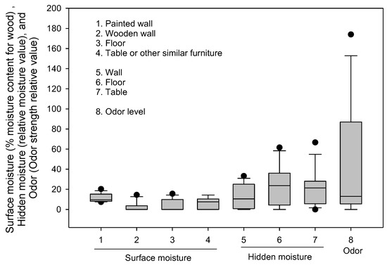The box plots illustrate variations in surface moisture (%), hidden moisture (relative moisture value), and odor levels (dimensionless relative value) across 13 sampled homes. The lower and upper boundaries of the box specify the 25th and 75th percentiles, respectively. The line within the box indicates the median, and the whiskers above and below the box indicate the 95th and 5th percentiles, respectively.