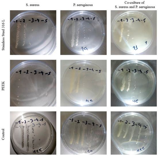 The assessment of the co-existence and adhesion to materials’ surface of S. aureus and P. aeruginosa was also verified. These two bacteria are the most common co-colonization pathogens in most infections and have a direct influence on wound healing, even in the oral cavity. The results obtained followed the same pattern as those obtained in monoculture (Figure 8). A bacterial adhesion mean reduction of 92% and 72% between SS and PEEK was observed in S. aureus and P. aeruginosa, respectively, for the co-culture evaluation. Regarding bacterial adhesion results obtained in co-culture, it was observed that there was a reduction in both specimens tested for S. aureus, compared with the results obtained in monoculture. On the other hand, P. aeruginosa bacterial adhesion results present an increment for stainless steel specimens, while for PEEK, a reduction was observed, when compared with monoculture.