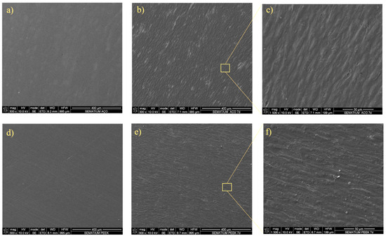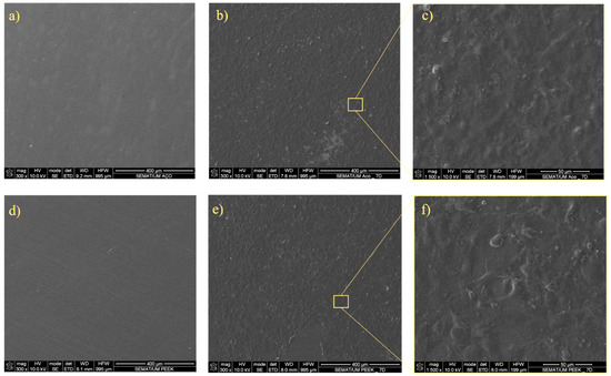 In Figure 9, the SEM images show the adhesion of S. aureus to the two tested specimens: SS (Figure 9a–c) and PEEK (Figure 9d–f). The SS samples exhibited a higher number of bacteria, corroborating the CFU/mL results presented in Figure 7. Similarly, the SEM images of P. aeruginosa adhesion (Figure 9, right) revealed a predominance of bacteria on SS compared with PEEK. In both cases, the bacteria formed large clusters on SS surfaces, whereas on PEEK, they appeared more sparsely distributed, forming small, scattered aggregates. Comparable findings were reported by Songmei et al. [55] in SS polished surfaces with nanoscale roughness. The percentage of surface area covered by bacteria presented a relative reduction of 87% and 83% between SS and PEEK for S. aureus and P. aeruginosa, respectively. These results corroborate the bacterial adhesion reduction observed in the experiments presented before; however, considering that the measurements were performed in single technical replicates, the results should be considered as strictly descriptive.
