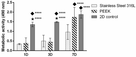 hFOB metabolic activity for up to 7 days of culture. Symbols denote statistically significant differences (** p < 0.01) in comparison to the following: (◆) Stainless Steel 316L; (⋆) PEEK. Data is presented as mean ± stdev (total n = 6 per condition).