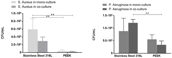 Bacterial adhesion (CFU/mL) to specimens PEEK and SS in monoculture and co-culture for the following: (a) S. aureus and (b) P. aeruginosa. The error bars correspond to the standard deviation and (**) to the statistically significant differences (p < 0.01) (total n = 3 per condition).