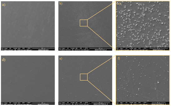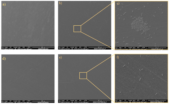 Representative micrographs of the adhered S. aureus bacteria to SS: (a) unseeded; (b) day 1 bacterial adhesion; and (c) day 1 bacterial adhesion with detail; and the adhesion to PEEK: (d) unseeded; (e) day 1 bacterial adhesion; and (f) day 1 bacterial adhesion with detail.