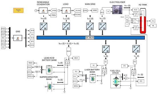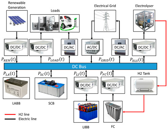 At small to medium scales, there is growing consensus favouring DC bus-based microgrid architectures incorporating HESS configurations with BBs/SCBs and hydrogen as an energy vector [3,10]. This trend reflects increasing adoption of sophisticated hybrid systems integrating diverse components (batteries, supercapacitors, electrolysers, fuel cells (FCs), etc.) and technologies (lead-acid and Li-ion batteries, polymer electrolyte membrane (PEM) and high-temperature FCs, alkaline and PEM electrolysers, etc.), resulting in more complex system architectures and control requirements [8,11]. Figure 1 illustrates a representative configuration featuring comprehensive HESS integration with multiple degrees of freedom, which serves as the foundation for this investigation.