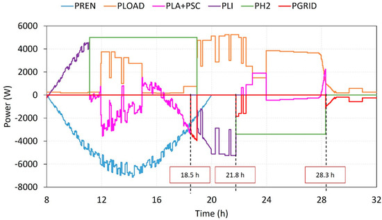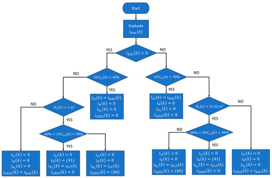 The operation of the microgrid, which is the basis of the model to be developed, assumes that renewable energy is not a control variable, i.e., all renewable energy is always harnessed through one or more of the following operations (performed by the corresponding EMS): powering loads, charging the SCB, charging the LABB, charging the LIBB, producing hydrogen, or selling electricity to the MEG.